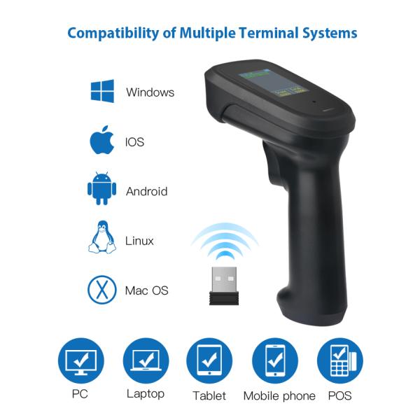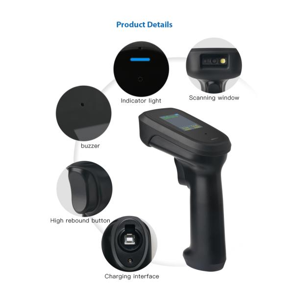 The screen can display barcode data , product name and price information, the current time, wireless (wired) status, wireless working mode, charging status and battery power, total stored data. The total number of decoding (the maximum count shows 99999), the number of pieces of data and the total number of times can be cleared by scanning the setting codes.